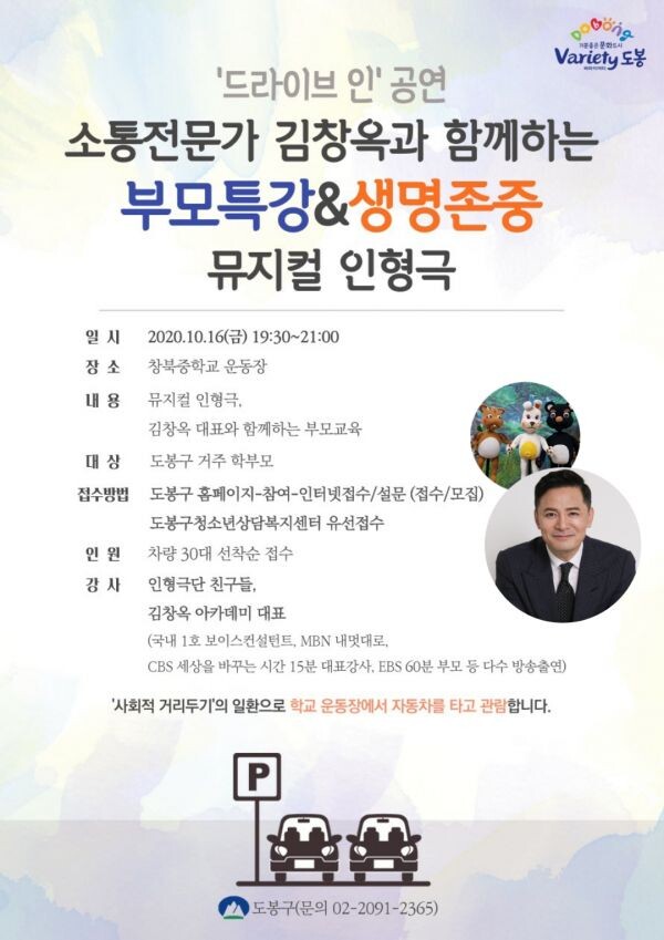 이동진 도봉구청장은 “코로나19로 대면 공연이 어려운 상황에서 드라이브 인 공연을 진행함으로써 심리적으로 어려운 시간을 보내고 있는 지역주민을 위로하고 학교폭력의 심각성과 생명존중에 대해 청소년과 학부모과 함께 생각해 볼 수 있는 장이 되기를 바란다”고 설명했다.
