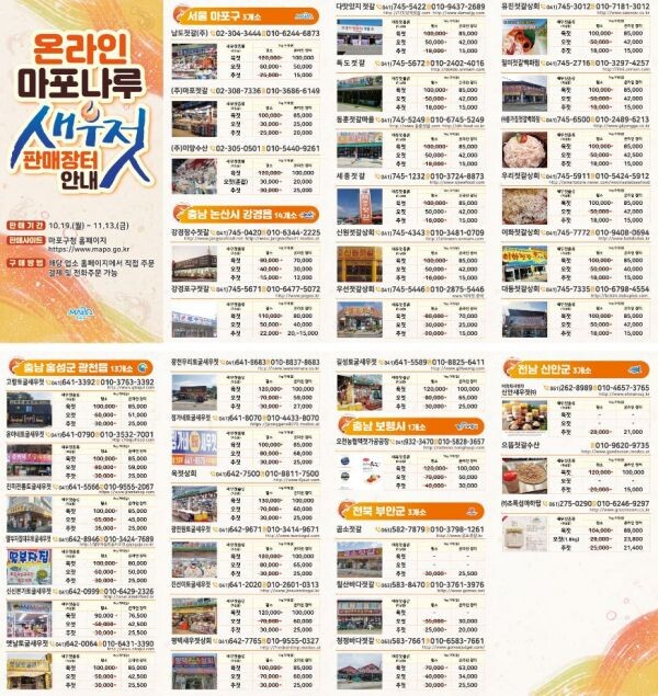온라인 방식으로 새롭게 열리는 마포나루 새우젓 장터는 10월 19일부터 11월 13일까지 약 한 달 동안 마포구청 누리집에서 만나볼 수 있다.