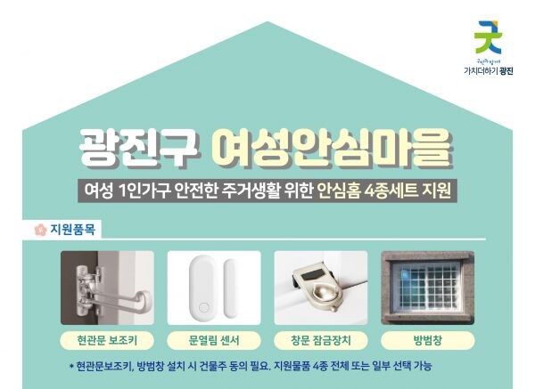 지원물품은 현관문 보조키, 문열림 센서 창문 잠금장치, 방범창 등 4종이며 설치는 광진구지역자활센터 나눔사업단에서 진행한다.