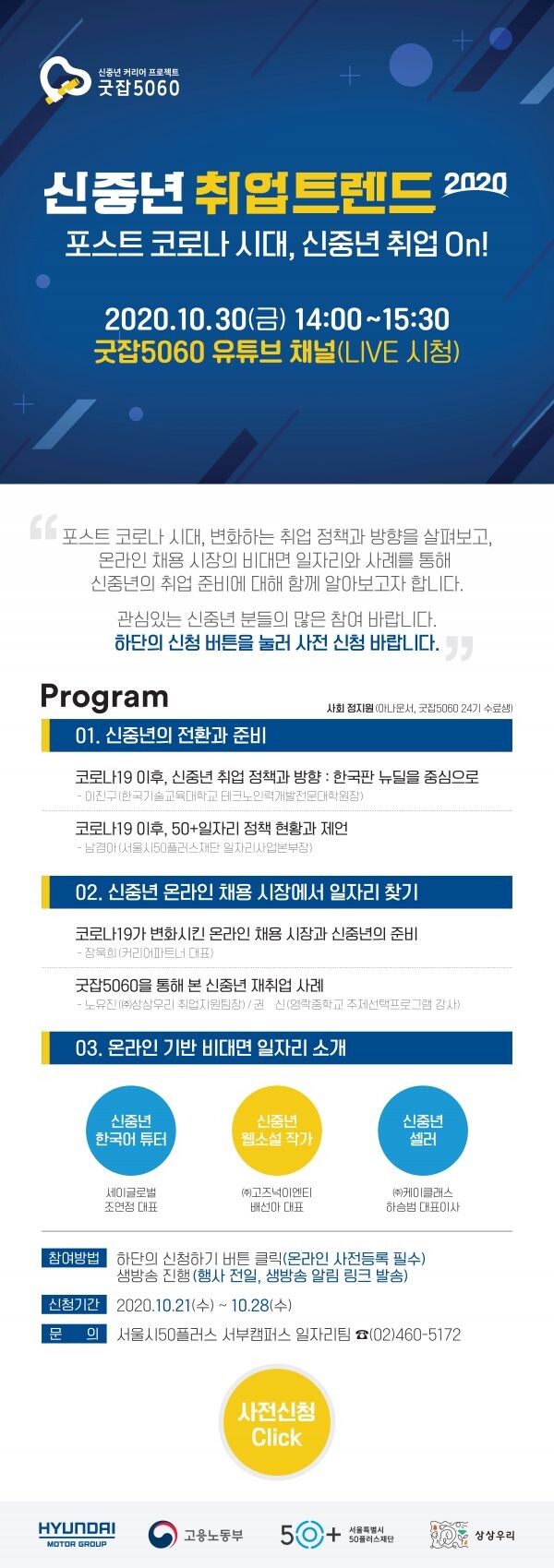 30일 오후 2시부터 1시간 30분간 진행되는 ‘신중년 취업트렌드2020’ 세미나는 비대면 시대에 취업을 고민하는 사람은 누구나 참여할 수 있도록 ‘굿잡5060 유튜브’ 채널을 통해 생중계로 진행될 예정이다.