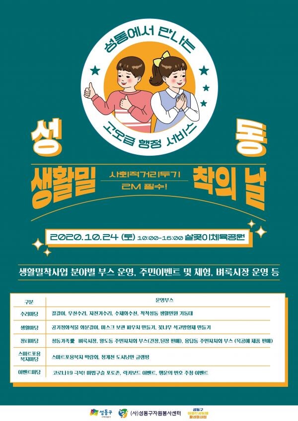 구 관계자는 “이번 행사는 구 뿐만 아니라 성동구자원봉사센터와 성동구아파트공동체활성화연합회 등이 함께하는 주민 전체행사로 구가 선제적으로 시행하고 있는 다양한 생활밀착 행정서비스에 대한 주민 수요를 한번 더 확인하고 코로나19로 위축될 수밖에 없었던 주민 공감·소통의 장을 마련한다”고 말했다.