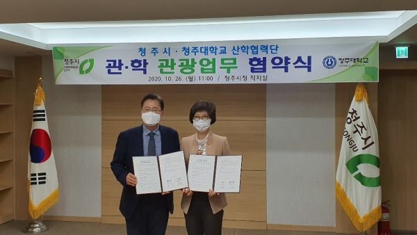 청주시가 26일 시청 직지실에서 김천식 문화체육관광국장, 홍양희 청주대학교 산학협력단장 등 관계자 6명이 참석한 가운데 청주시·청주대학교 관광업무 협약식을 가졌다.