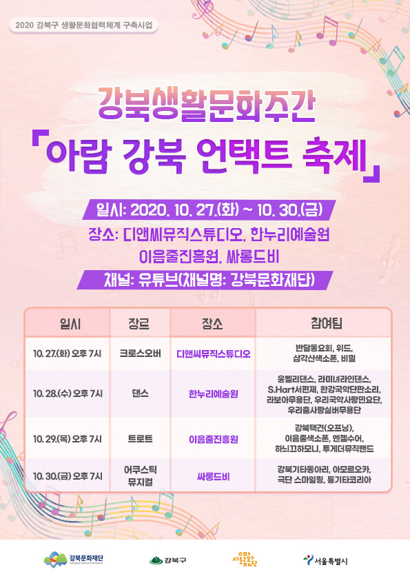 프로그램은 축제 기간 동안 매일 오후 7시 강북문화재단 유튜브 채널을 통해 실시간 생중계로 만나볼 수 있다.
