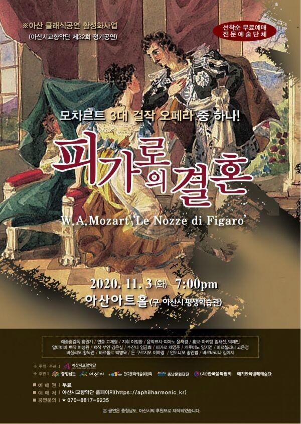 [무한뉴스] 아산시 교향악단이 오는 11월 3일과 6일 아산아트홀에서 제32회 정기공연 오페라 ‘피가로의 결혼’과 제33회 정기공연 창작 뮤페라 ‘삼월하늘’을 개최한다.