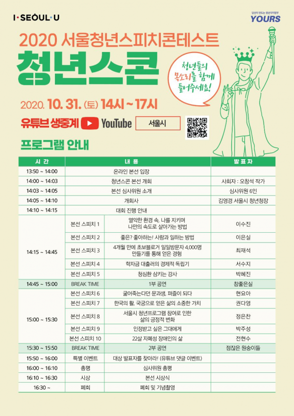 본선 대회는 코로나 시기임을 감안해 온라인 생중계로 진행되며 서울시 공식 유튜브를 통해 보다 생생하게 참가자들과 소통할 수 있다.