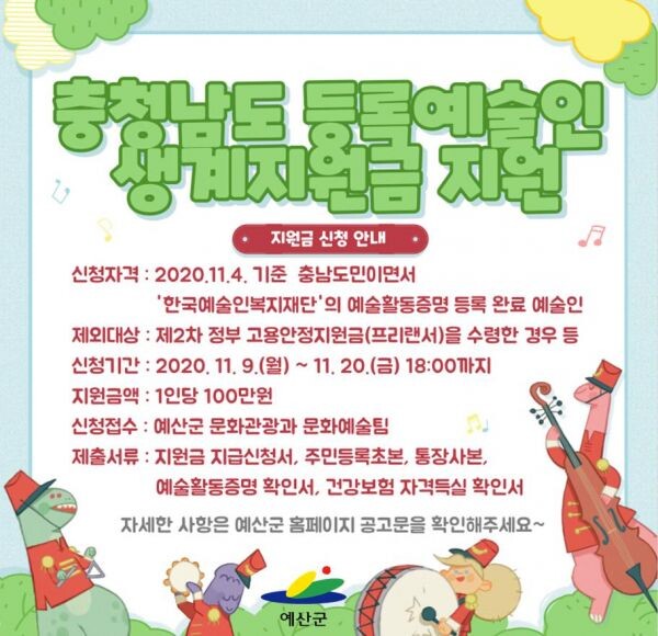 지원대상은 11월 4일 기준, 충남도민이면서 ‘한국예술인복지재단’의 예술활동증명 등록이 완료된 예술인이다.