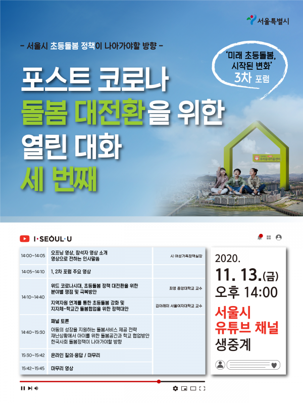 3차 포럼도 이전 포럼과 마찬가지로 코로나19 감염 예방을 위해 비대면 방식으로 서울시 유튜브 채널을 통해 실시간 생중계되며 초등돌봄에 관심있는 모든 분들이 온라인으로 참여 가능하다.