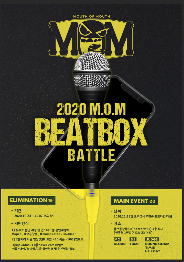 2018년 시작돼 올해 3회째를 맞는 ‘2020 Mouth of Mouth 비트박스 경연대회’는 전국의 실력 있는 비트박서를 발굴하고 다양한 장르의 음악가가 창동으로 모여들 수 있도록 지원하는 경연대회다.