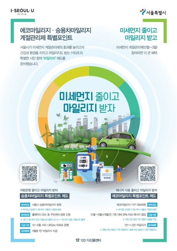 서울시 김연지 환경시민협력과장은 “고농도 미세먼지가 집중되는 기간에 난방에너지와 차량운행을 줄이면 미세먼지도 줄고 마일리지혜택도 받을 수 있다”며 “계절관리제 특별포인트에 많은 시민들의 관심과 참여를 바란다”고 당부했다.