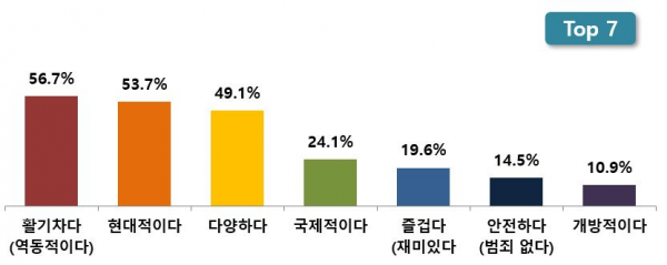 서울시와 어울리는 이미지에 대한 질문에는 활기차다·역동적이다, 현대적이다,다양하다,국제적이다,즐거운도시 등을 꼽았다.