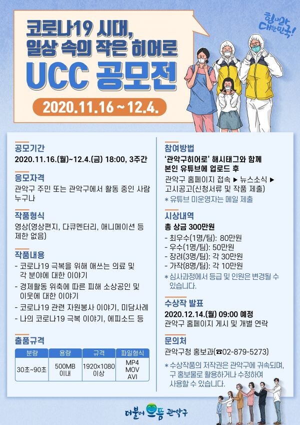 공모 내용으로는 코로나19 극복을 위해 애쓰는 의료 및 각 분야의 진솔한 이야기 경제활동 위축에 따른 피해소상공인 및 이웃에 대한 희망메시지 코로나19관련 자원봉사나 미담사례 본인의 코로나19 극복이야기 등 구민에게 희망을 주는 내용이다.