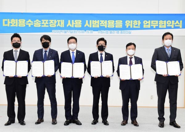수원시와 환경부, 롯데마트·NS홈쇼핑·오아시스마켓, 온다고는 17일 수원시청 중회의실에서 ‘다회용 포장재 사용 시범 적용을 위한 업무협약’을 체결하고 수송 포장재 감축을 위해 적극적으로 협력하기로 했다.