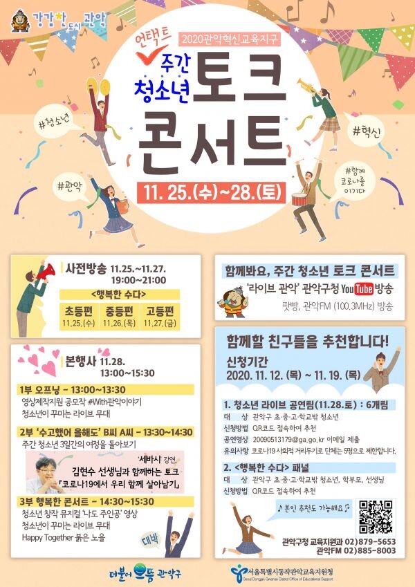 박준희 구청장은 “이번 행사가 코로나19 장기화에 지쳐있는 청소년들이 서로 위로하고 소통할 수 있는 시간이 되길 바란다”며 “앞으로도 관악의 미래인 청소년들이 힘든 시기를 지혜롭게 이겨낼 수 있도록 다방면의 지원을 아끼지 않겠다”고 말했다.