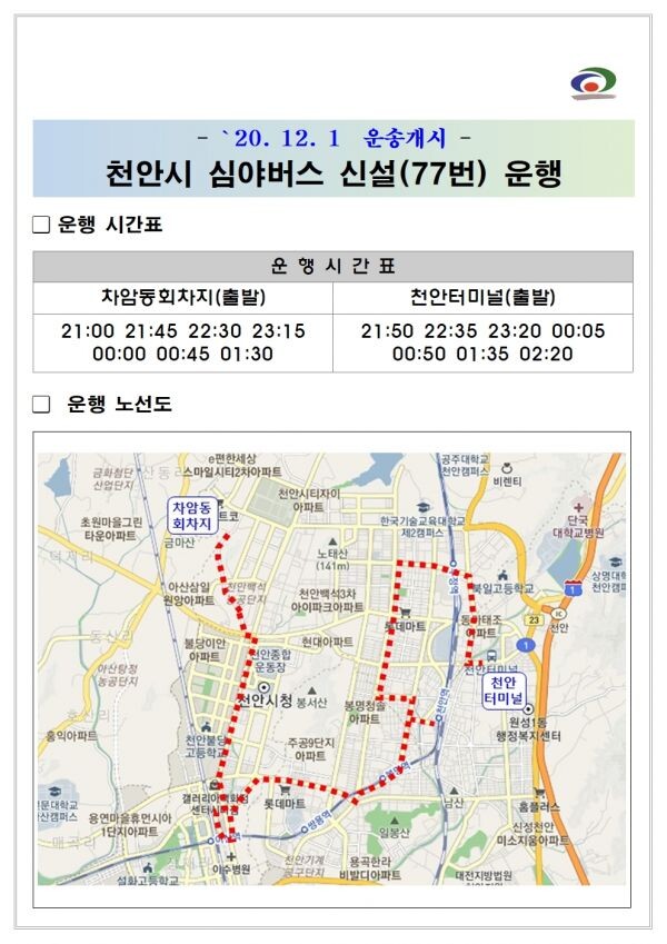 시 관계자는 “그동안 천안터미널 및 전철역, KTX 등 운행 종료시간에 비해 시내버스 운행종료 시간이 빨라 시내버스 연장 운행이 필요하다는 민원에 따라 심야시간대 대중교통 이용자의 이동권 복지 차원에서 심야버스를 도입하게 됐다”며 “향후 심야버스와 관련한 운행 평가를 통해 심야버스 노선을 확대할 계획”이라고 말했다.