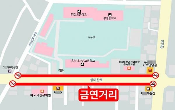 이번 금연거리 지정 구역은 경성중·고등학교 및 홍익디자인고등학교 주변을 둘러싼 통학로로 총 520m 구간이다.