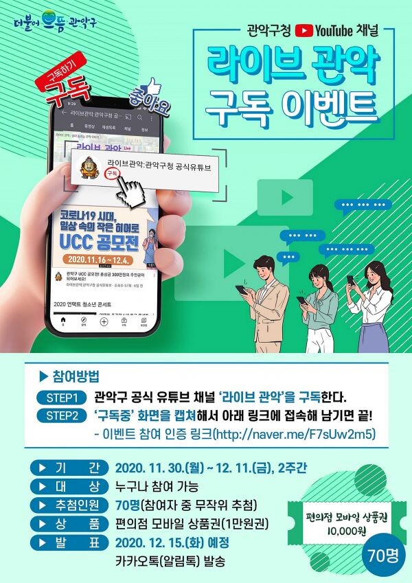 참여방법은 먼저 유튜브 ‘라이브 관악’ 채널 ‘구독’을 누른 후 ‘구독중’ 화면을 캡쳐해 이벤트 참여 인증 링크에 접속해 올리면 된다.