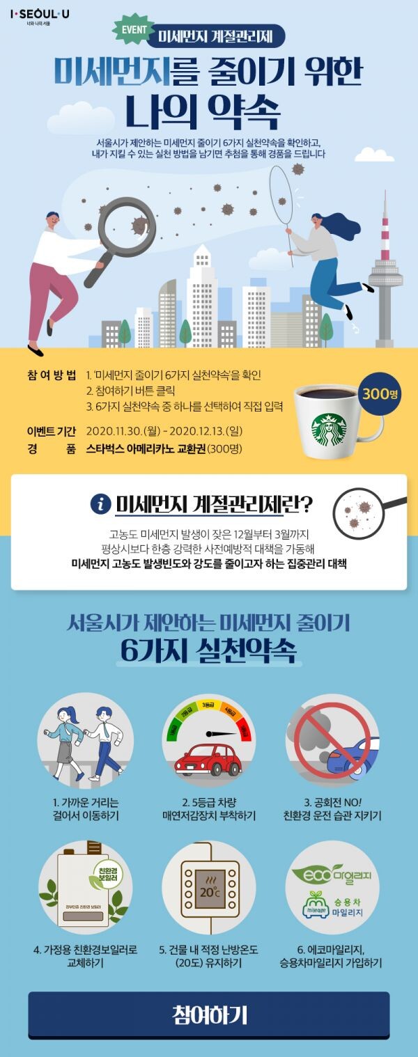아울러 서울시는 미세먼지 계절관리제 기간 중, 시민들이 일상 속에서 미세먼지를 줄일 수 있는 6가지 실천약속을 제안했다.
