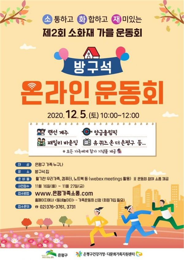 2020년에는 코로나19로 인해 대규모 행사가 불가능한 상황을 고려해 가정 내에서 가족과 함께 안전하게 즐길 수 있도록 레크레이션, 팀 대항전 등 은평 가족이 함께 하는 비대면 운동회를 개최한다.
