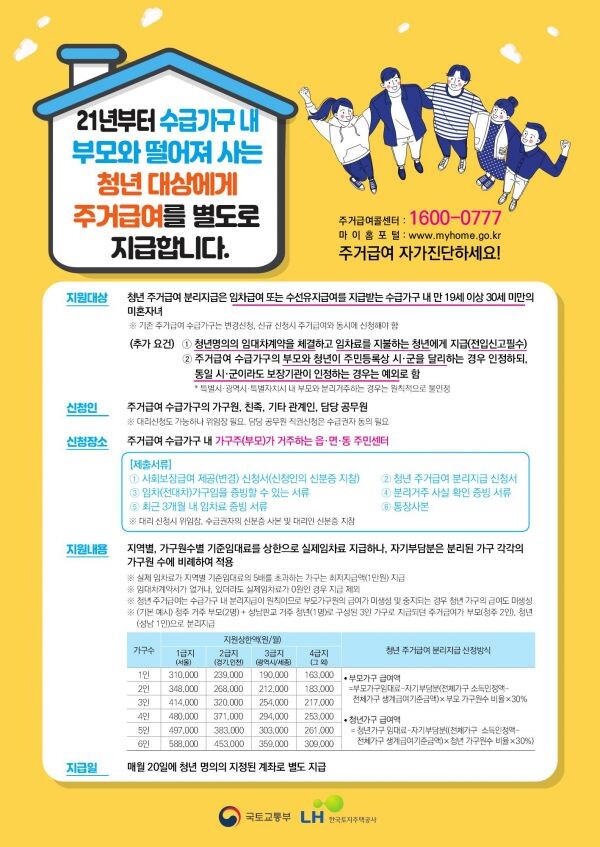 ‘청년 주거급여 분리지급’은 저소득층 청년이 취학과 구직 등을 목적으로 부모와 거주지를 달리하는 경우에도 별도로 주거급여를 받아 주거비를 마련할 수 있도록 국토교통부가 개정 시행하는 제도다.