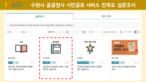수원시 홈페이지 ‘수원만민광장→설문조사’ 게시판에서 ‘공공청사 시민공유 서비스 시민 만족도 설문조사’ 배너를 클릭해 참여할 수 있다.