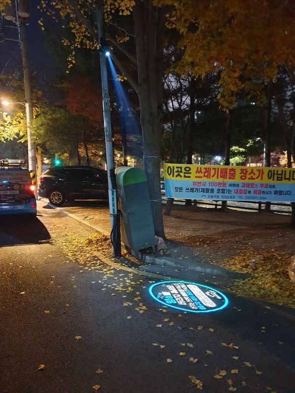 이번에 설치된 로고젝터는 쓰레기 무단투기금지, 쓰레기 배출지정장소 외 무단배출금지 등 2가지 종류의 문구가 회전하며 바닥에 투사된다.