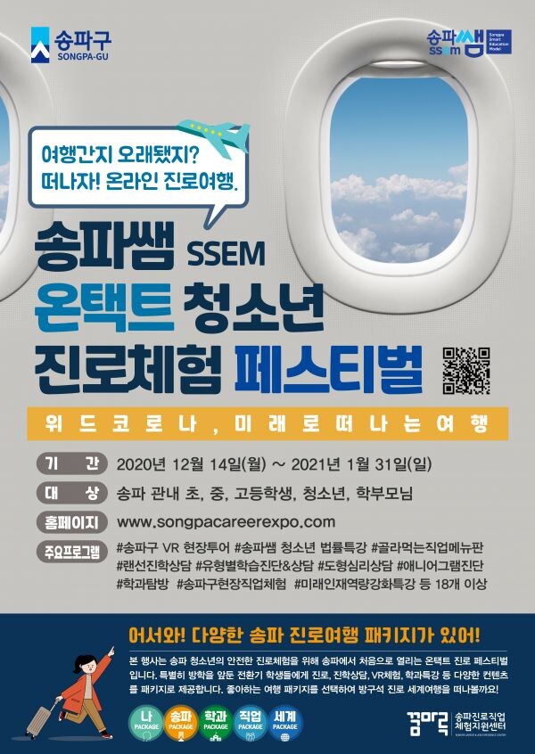 먼저, ‘나 패키지’에서는 랜선진학상담 학과계열 선정 및 유형별 학습법 진단검사 애니어그램&도형심리상담을 통한 자아탐색 및 진로진단이 가능하며 ‘송파 패키지’에서는 날로먹는 VR 현장투어 골라먹는 직업메뉴판 꿈마루 송터뷰를 통해 관내 직업 체험처를 탐험하고 다양한 직업군에 대한 직업탐색이 가능하다.