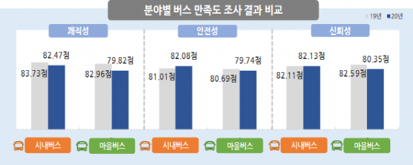 시내버스는 항목별 만족도 중 ‘쾌적성’ 항목에서 가장 좋은 평가를 받았고 ‘안전성’ 항목은 1.07점 오른 82.08점, ‘신뢰성’ 항목은 0.02점 오른 82.13점을 받았다.