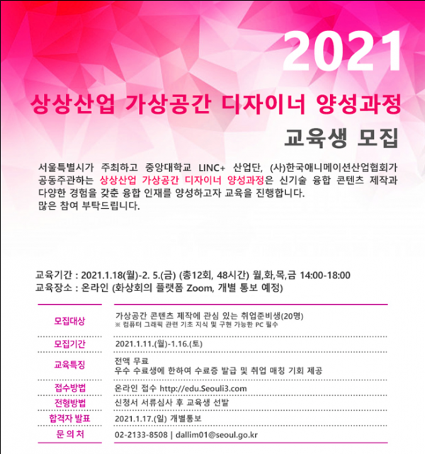 올해 처음 도입하는 ‘가상공간 전문가 양성’ 1기는 총 20명을 선발, 3주간 온라인을 통해 12회의 교육을 진행한다.