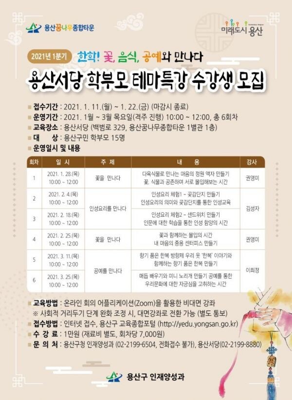 성장현 용산구청장은 “매 분기 새로운 형태로 학부모 특강을 이어오고 있다”며 “이번에는 꽃, 음식, 공예라는 주제를 전통 한학에 접목시켰다 주민들의 많은 관심을 바란다”고 말했다.