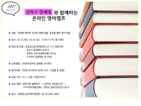 성북청소년미래지원센터 관계자는 “코로나19 장기화로 가정에서 보내는 시간이 많은 아이들이 놀이와 영어학습을 함께 할 수 있는 유익한 시간이 되기를 바란다”고 밝혔다.