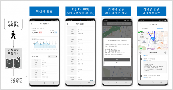 “My-T” 앱 에서 수집 되는 개인 위치정보와 대중교통 운행정보, 교통카드 승하차정보, 교통수단별 Wi-Fi 정보 등이 결합· 분석되어 개인 통행·이동 궤적과 확진자 이동 동선을 비교해 확진자 접촉 여부를 알려준다.