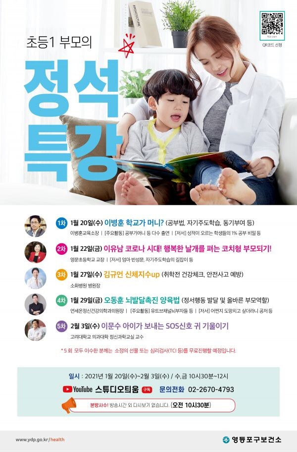 ‘초등1 부모의 정석 특강’을 수강하고자 하는 구민은 구 유튜브 채널 ‘스튜디오 틔움’에 강의 당일 시간 맞춰 접속하거나, 포스터에 인쇄된 QR코드를 이용해 신청하면 된다.