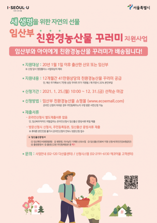 ‘임산부 친환경농산물 꾸러미’는 임산부가 필요한 품목을 장바구니에 담아서 직접 주문하는 선택형 꾸러미와 가격대, 품목에 맞게 선택 구성해 주문하는 완성형 꾸러미 2종류의 ‘꾸러미’ 상품으로 운영된다 현재 3개 공급업체를 선정 중이며 2월 중 ‘임산부 친환경농산물 꾸러미’ 주문과 배송을 시작한다 임산부 친환경농산물 꾸러미 지원사업에 관한 자세한 사항은 시 홈페이지와 서울농부포털에서 확인할 수 있다.