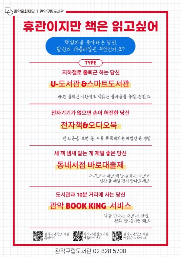 1인당 5권의 대출이 가능하며 자세한 내용은 관악구 통합도서관 홈페이지에서 확인할 수 있다.