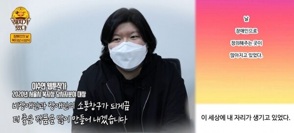 지난해에는 청각장애인이 일상생활에서 겪는 어려움 등을 에피소드 형식으로 재치 있게 담아낸 자전적 웹툰 ‘나는 귀머거리다’를 통해 장애 인식개선과 장애인 인권 증진에 앞장선 프리랜서 웹툰작가 ‘이수연’ 씨가 대상을 수상해 많은 사람들에게 희망과 감동을 전한바 있다.