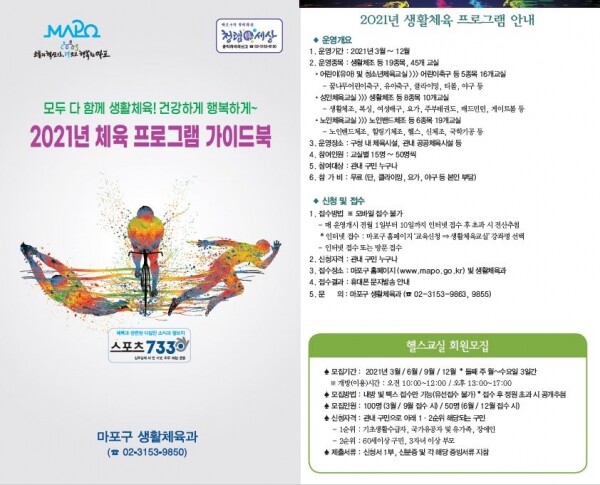 프로그램 참여를 원하는 구민은 오는 10일 오후 6시까지 마포구 누리집의 ‘교육신청-생활체육교실’을 통해 인터넷 신청하거나 마포구청 11층 생활체육과로 방문해 신청하면 된다.