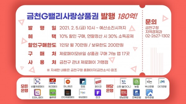 금천G밸리사랑상품권은 개인 1인당 월 70만원 한도 내에서 10% 할인된 금액으로 상품권을 구매할 수 있으며 구에 등록된 지역사랑상품권가맹점 7,725곳에서 QR결제 방식으로 사용할 수 있다.