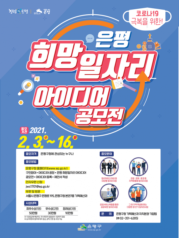김미경 은평구청장은 “공모전을 통해 위축된 지역경제에 활기를 불어넣고 21년 변화된 일자리 환경에 맞춰 지역 특성을 살릴 수 있는 다양한 아이디어를 기대하며 관심 있는 분들의 많은 참여를 바란다”고 말했다.