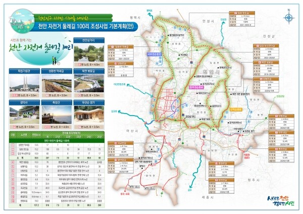 새롭게 조성되는 천안형 자전거 둘레길 100리는 연장 39.6km에 달하며 성환천 억새길과 입장 포도길, 입장부소문이길 등 지역 자연경관이 배경이 되는 명소를 연결하는 방식으로 추진한다.
