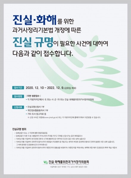 진실규명 신청 기간은 2020년 12월 10일부터 2022년 12월 9일까지 2년간이며 희망자는 신청서를 작성해 주소지 관할 시·군·구나 시·도 또는 서울시 소재 진실화해위원회에 직접 방문 제출하거나 우편 등을 이용해 제출하면 된다.