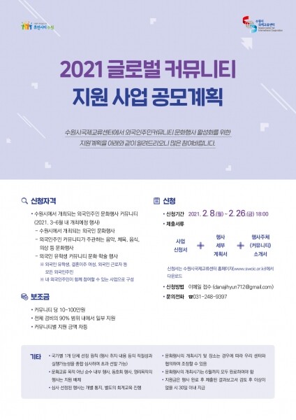 수원시국제교류센터는 행사 목적, 적절성, 실행 가능성 등을 평가해 3월 중 지원 단체를 선정할 예정이다.