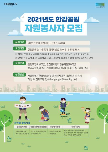 서울시 한강사업본부는 올해 전체 11개 한강공원에서 봉사활동을 진행할 개인 및 단체 자원봉사자를 2월 16일부터 3월 15일까지 4주간 모집한다고 밝혔다.