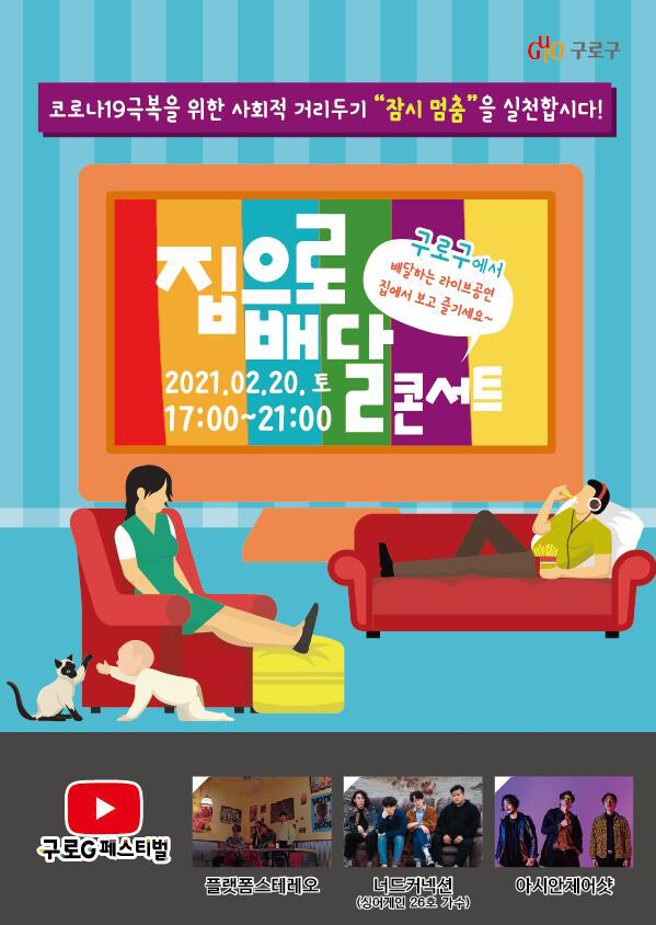 이번 ‘집으로 배달’ 온라인 콘서트는 20일 오후 5시부터 3부에 걸쳐 진행되며 구로G페스티벌 유튜브 채널을 통해 실시간 송출된다.