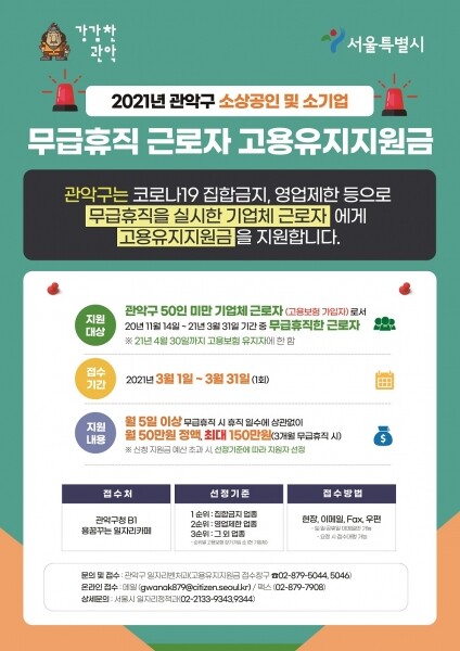 신청서류 및 더 자세한 사항은 관악구청 홈페이지에서 지원신청 안내 내용을 참고하거나 일자리벤처과 고용유지지원금 지원단으로 문의하면 된다.