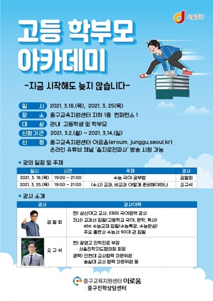 중구진학상담센터에서 준비한 이번 아카데미는 변화된 입시에 대비해 현직 고등학교 교사이자 입시전문가가 전하는 정시와 수시 준비방법으로 성공적인 대입 전략을 세우는데 도움을 주고자 한다.