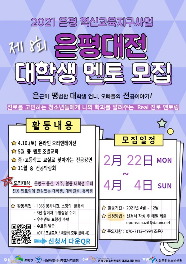 현재 은평대전 사업에 참여할 대학생 멘토를 모집 중에 있으며 작년 초에는 230명의 역대 최다 인원이 모집된 바 있다.