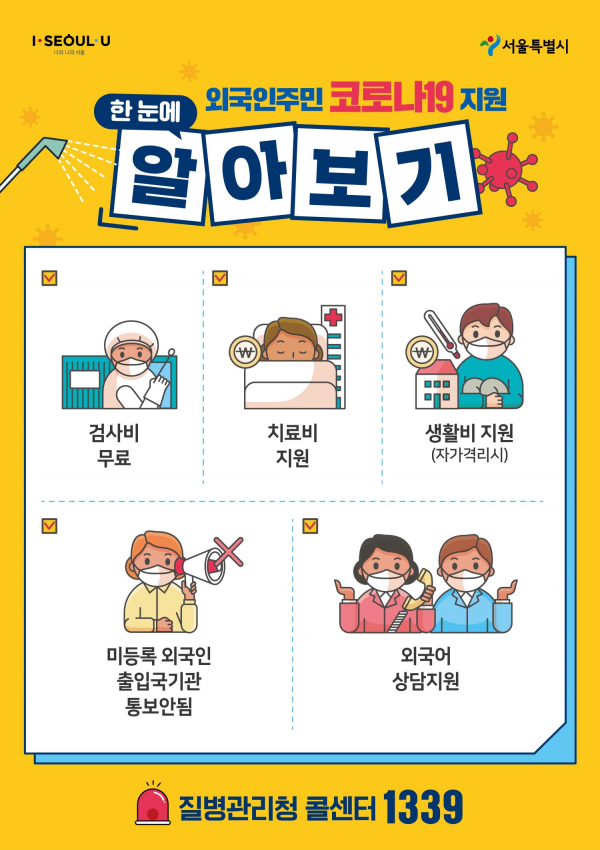 주요 안내사항은 코로나19 검사비 무료, 자가격리 시 생활비 지원, 확진 시 격리입원치료비 전액 지원, 불법체류자 출입국기관 통보의무 면제 외국인지원시설을 통한 다국어 통역지원 등이다.