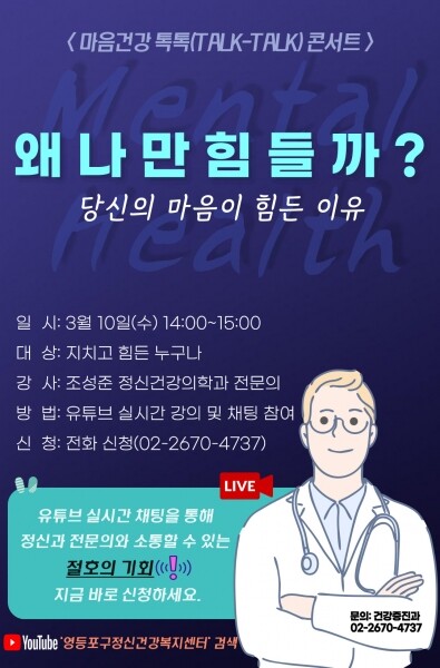 ‘마음건강 톡톡 콘서트’는 정신건강의학과 전문의와 실시간 소통할 수 있는 창구를 마련하고 정신건강에 대한 올바른 정보를 제공함으로써 코로나19로 지친 구민들의 마음을 달래기 위해 마련한 힐링 프로그램이다.