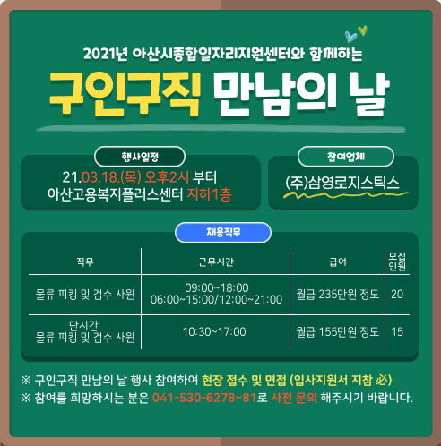 이날 행사의 구인업체인 ㈜삼영로지스틱스는 항공 및 육상 화물 취급업체로 오는 4월 염치읍에 새로 물류센터를 오픈한다.