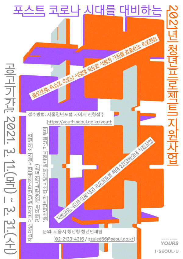 서울시는 정치·경제·문화 등 각 분야에서 과소대표 되어온 청년세대의 목소리를 대변하고 코로나로 인해 어려움을 겪는 청년단체·기업·프리랜서를 지원해 청년활동생태계도 활성화시킨다는 목표다.